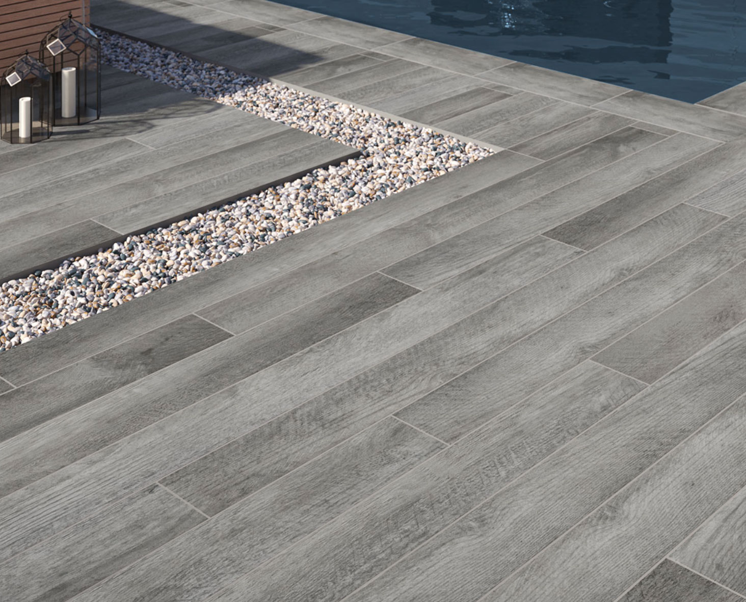 Bring the luxury of wood to your indoor and outdoor space with the Katella Ash Arterra Pavers. A stunning gray background with realistic grains and knots enhances the elegance and true-to-life finish of these 8”x47” pavers.